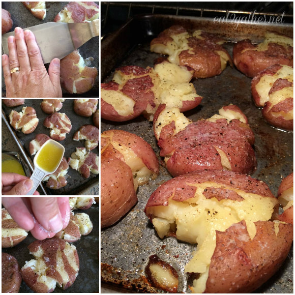 Place potatoes on a baking sheet, take a large metal spatula and smash each potato flat.