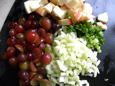 - Add cooled chicken pieces, apples, grapes, celery, and green onion to a mixing bowl