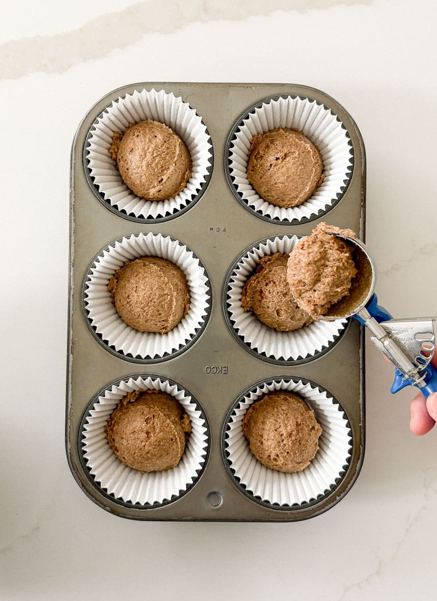 Using a large cookie cookie scoop or a measuring cup fill lined muffin tins 3/4 full. I use a 1/4 cup cookie scoop plus another half a scoop, a scant 1/2 cup also works perfectly.
