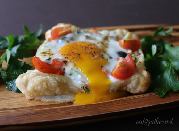 Cut each sheet of pastry dough into four squares, pinch corners together like so (making a shallow box), fill with Mediterranean filling, bake for 10 minutes remove, brush pastry with egg white and water wash, crack an egg in the middle of your tart, return to the oven, and bake for another 10-12 minutes or until white of egg has set.