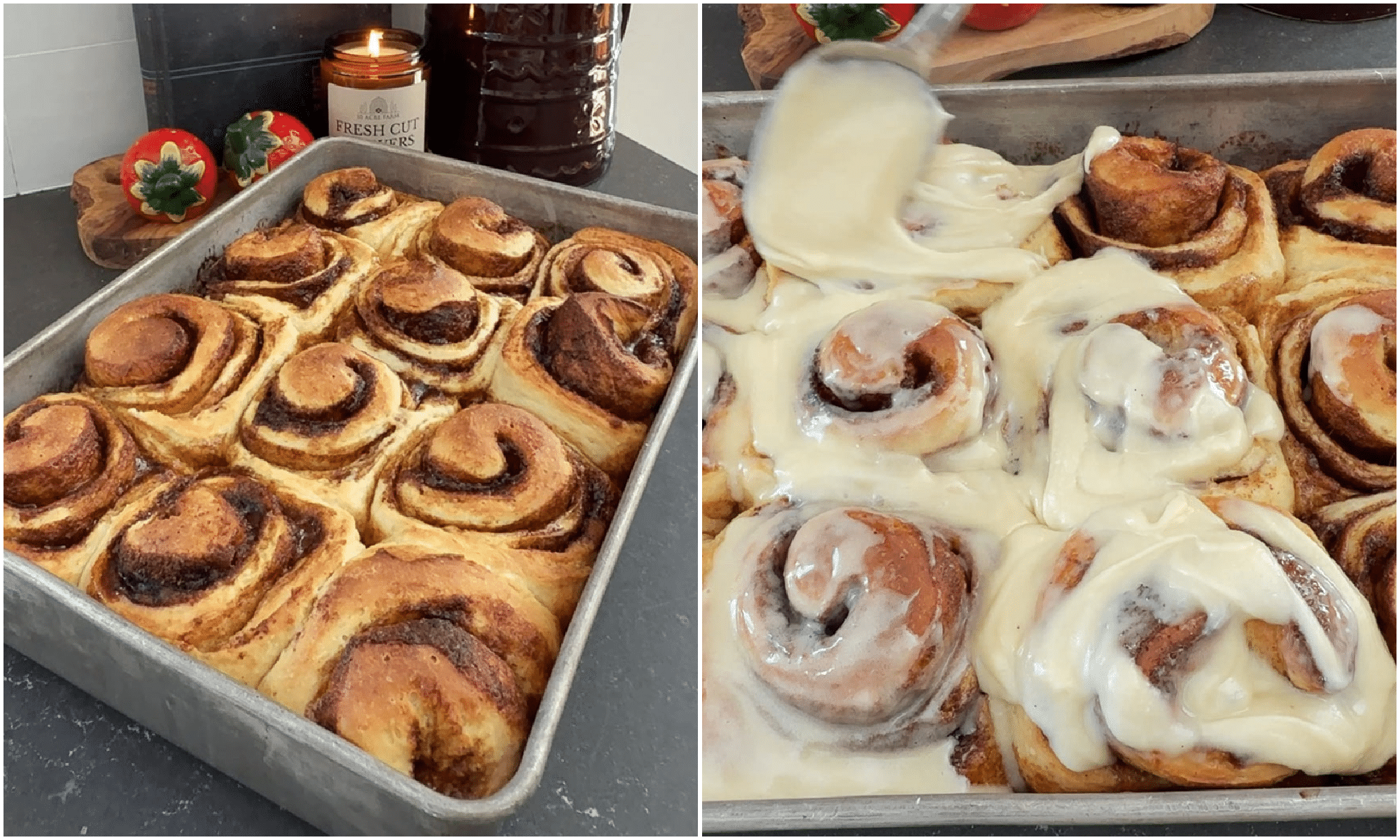 cinnamon rolls un frosted, and cinnamon rolls being frosted on the right side of the picture collage
