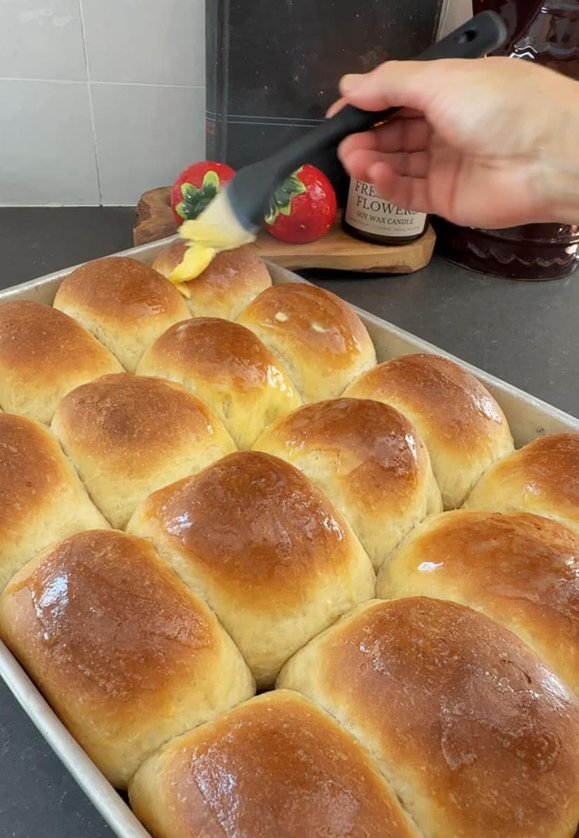 • Brush with melted butter: Just before or right after baking, brush the tops with melted butter (and even a drizzle of honey) for glossy, golden perfect rolls.