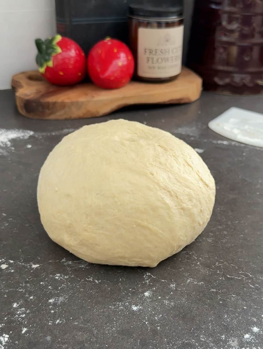 • Place remaining 1/4 cup flour on countertop and dump dough out onto the flour. Knead dough until it forms into a smooth ball. If dough still is overly sticky you can add 1 tablespoon of flour at a time until it is manageable. However, this dough is not a stiff dough so be careful not to add too much flour.