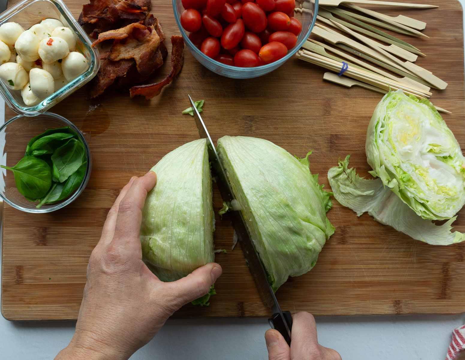- Skewer 2 tomatoes, a basil leaf, a ball of mozzarella, a piece of bacon and then stick each skewer into the top of the lettuce wedge. arrange on a platter surrounded by toppings and dressings.