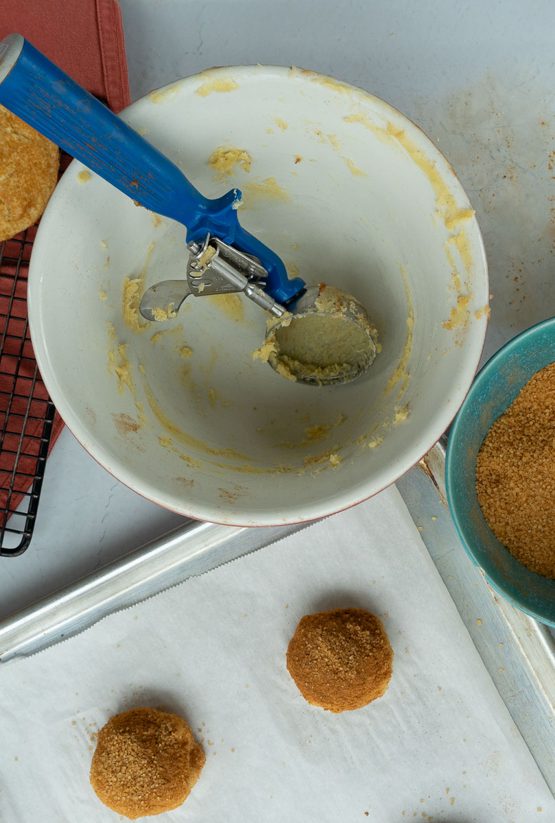 - Combine 1 cup turbinado sugar with cinnamon. Using a large cookie scoop or an ice cream scoop, scoop out cookie dough, roll it into balls, and dip it in sugar and cinnamon, making sure that a good amount of sugar sticks to the dough. My cookie dough balls weighed 2.5 oz. Place on a parchment-lined cookie sheet and press the dough down with the palm of your hand.