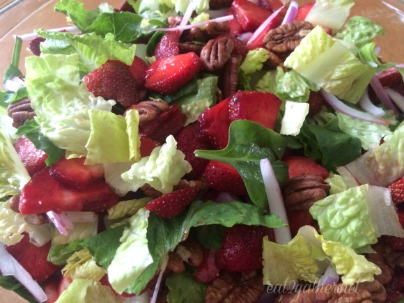 - Toss romaine and spinach together add onion, pecans, and sliced strawberries. Toss lightly.