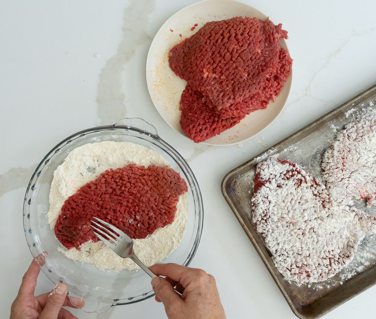 - Dredge steaks in seasoned flour and set aside on a clean plate. *reserve flour for gravy