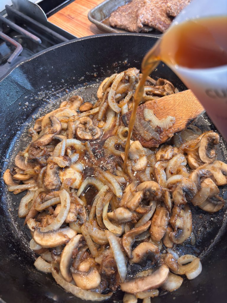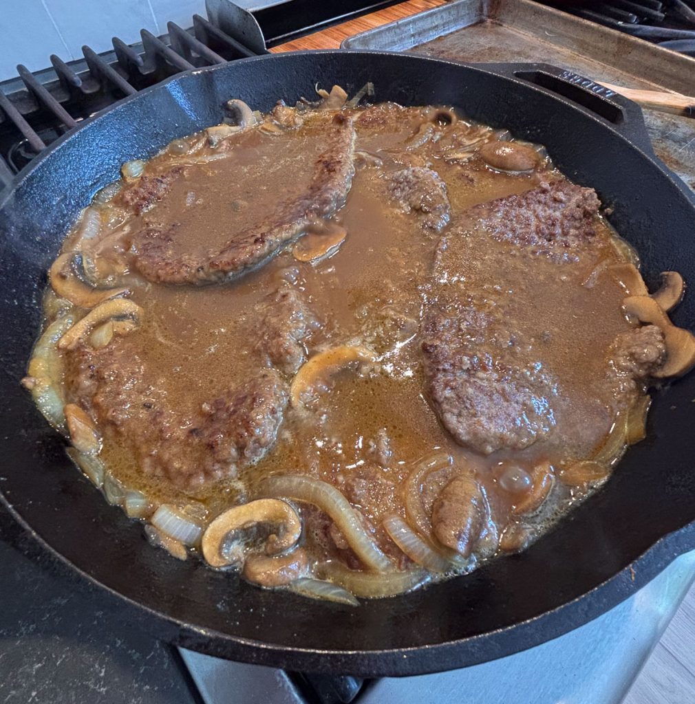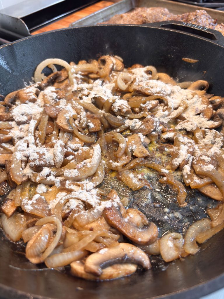 My recipe differs from some you’ll find out there in that the gravy doesn’t contain tomato sauce, tomato paste, or bell peppers. My mom made this Swiss steak recipe often when I was growing up. The recipe was given to her by my dad’s mom, who grew up on a large farm and was used to cooking for all the farm hands and family that worked her family’s farm. It’s simple, comforting, and comes together very quickly. I doubt that mushrooms were included in the 1920s. My grandfather was known to forage for mushrooms, so maybe grandma did include them. All I know is that I loved it growing up, and my kids still love this meal. If you are lucky to have leftovers, this meal is even better the next day. The ingredient list is below. With a few simple ingredients, you will be able to make a comforting meal that doesn’t break the bank, and that is saying a lot these days!