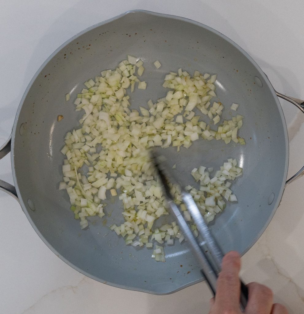Without cleaning the pan, add 3/4 cup chopped onion to it. The moisture from the onions will help loosen all the browned goodness from the chicken. Using a spatula, saute onions and loosen browned bits when they start to look translucent.