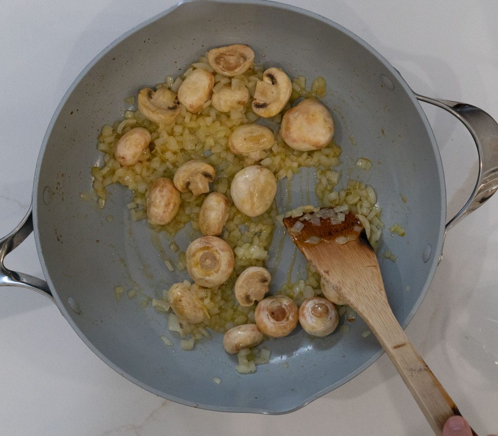 Add mushrooms to the pan and saute with the onions. Cook mushrooms until they start to brown and give off water.