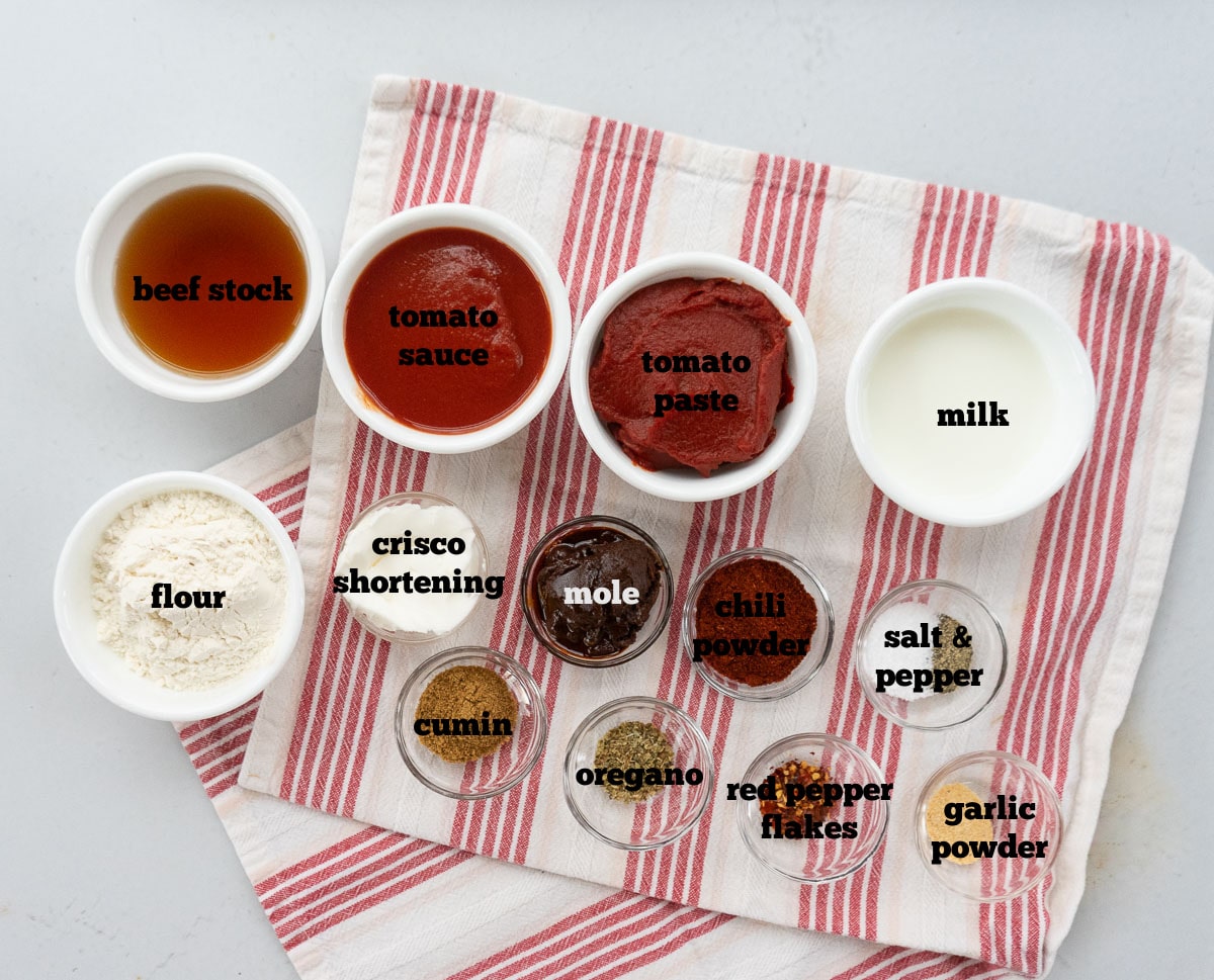 ingredients for the wet burrito red sauce set out on a white countertop with a red and white striped towel