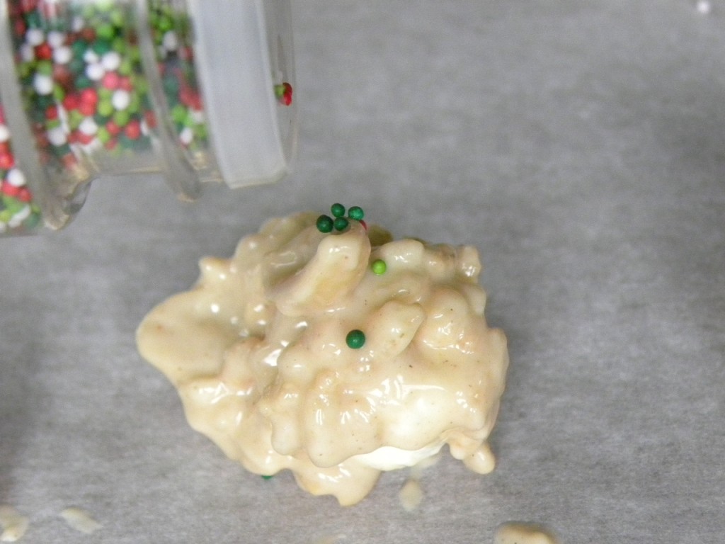 - Drop bite sized spoonfuls onto parchment paper. Sprinkle immediately with what ever Christmas or Holiday sprinkles you have. You want to do this before the chocolate sets up so the sprinkles stick to the candy. Let stand for 30 minutes or until set up.