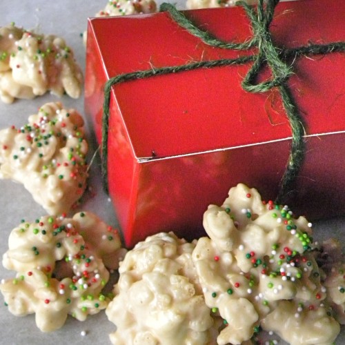 Sweets are my downfall. Salty sweets. Especially, peanut buttery salty sweets. OK, you get the idea. White Chocolate Christmas Candy is all that. Sweet, peanut buttery, with just a titch of salt from the peanuts, and crunch from the Rice Krispies. HEAVEN help me. I can’t have these things around. My mom always made them around Christmas time. We called them Christmas Star Candy because we used the white chocolate star candy to make them. But I haven’t been able to find white chocolate star candies in years. So I use white chocolate chips and call it White Chocolate Christmas Candy….it works. They are so doggone easy. Honestly, I was making them on my own by the time I was in second grade. My momma was good that way, just letting me go in the kitchen, while she was nearby, reading her Harlequin Romance in the recliner. Absolutely no helicoptering was going on in my house growing up, quite the opposite, but those days are done, and I actually survived somewhat unscathed. Ok enough about my childhood, this candy is incredible and so easy, you must add it to your holiday baking lineup!